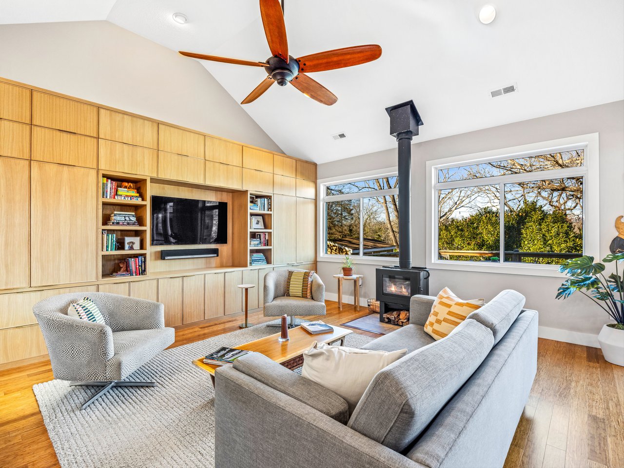 Discover modern mountain living in the heart of Asheville's coveted Northside neighborhood, just minutes from downtown's best shops, restaurants, and nightlife. This newer-built home stands out with high-end finishes, abundant natural light, and flexible living spaces. The entryway opens into a spacious great room, where vaulted ceilings and a cozy wood-burning stove create an inviting atmosphere. Custom built-in cabinetry and a striking waterfall island anchor an open concept kitchen-great room, creating a polished, functional space ideal for both everyday living and entertaining.